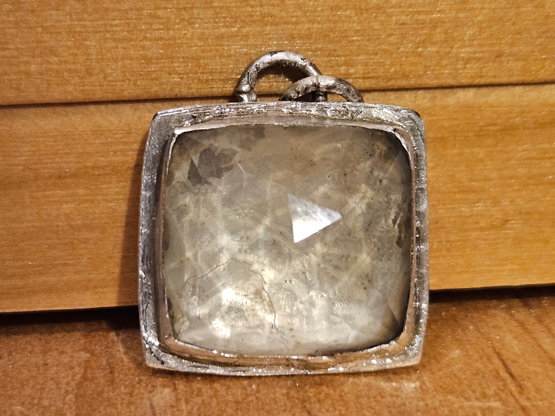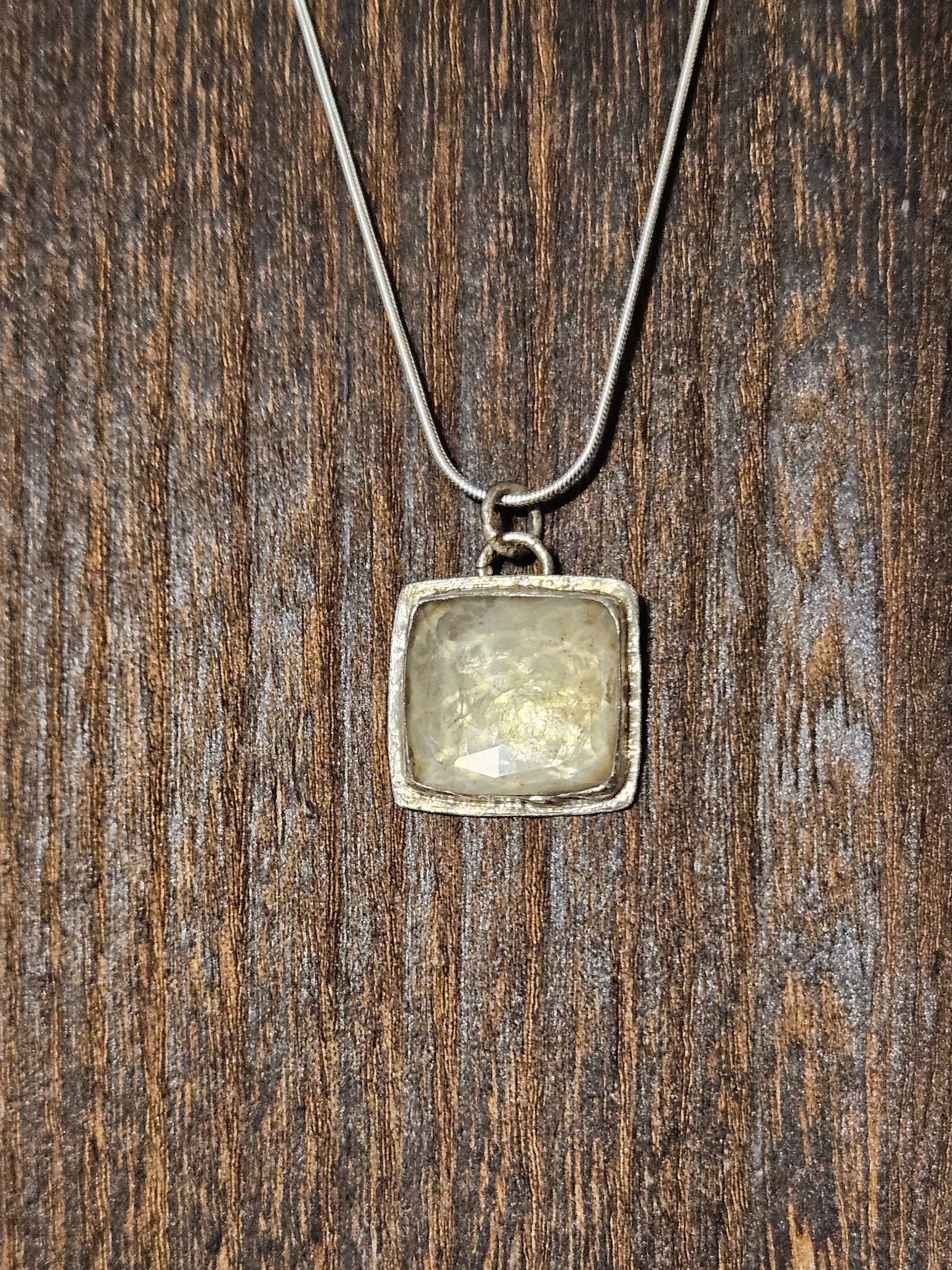 This glowing square-cut moonstone is set in .999 fine silver and hangs from an 18" hypoallergenic rhodium-plated sterling silver chain. With its softly faceted surface and pearly, iridescent flash, this piece radiates quiet mystery and elegance. The hand-textured bezel adds a raw, artisanal feel that balances the refined cut of the stone, giving it both polish and personality.