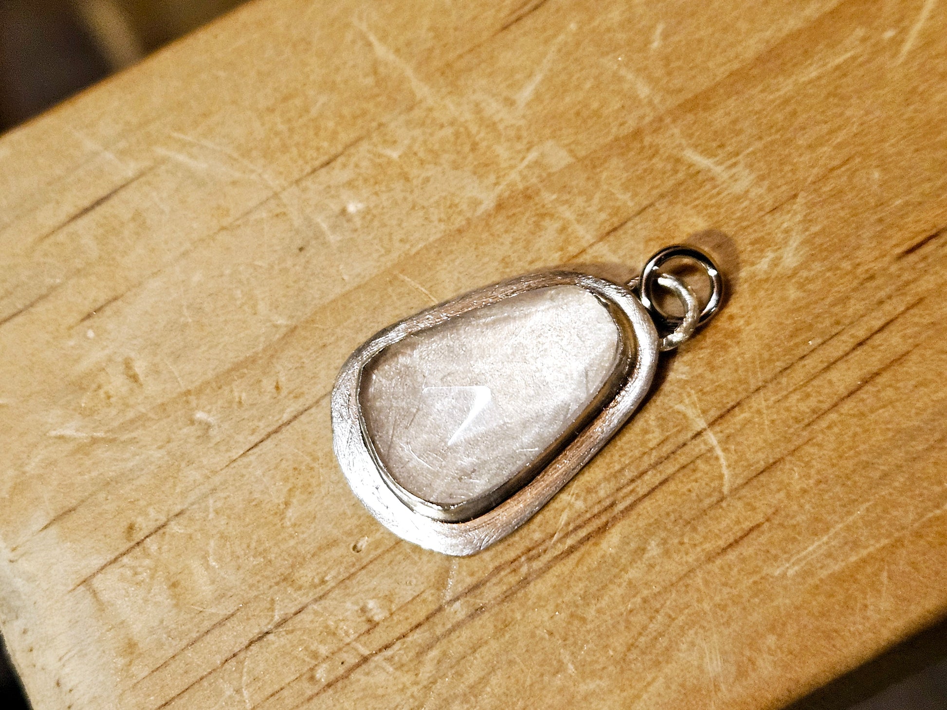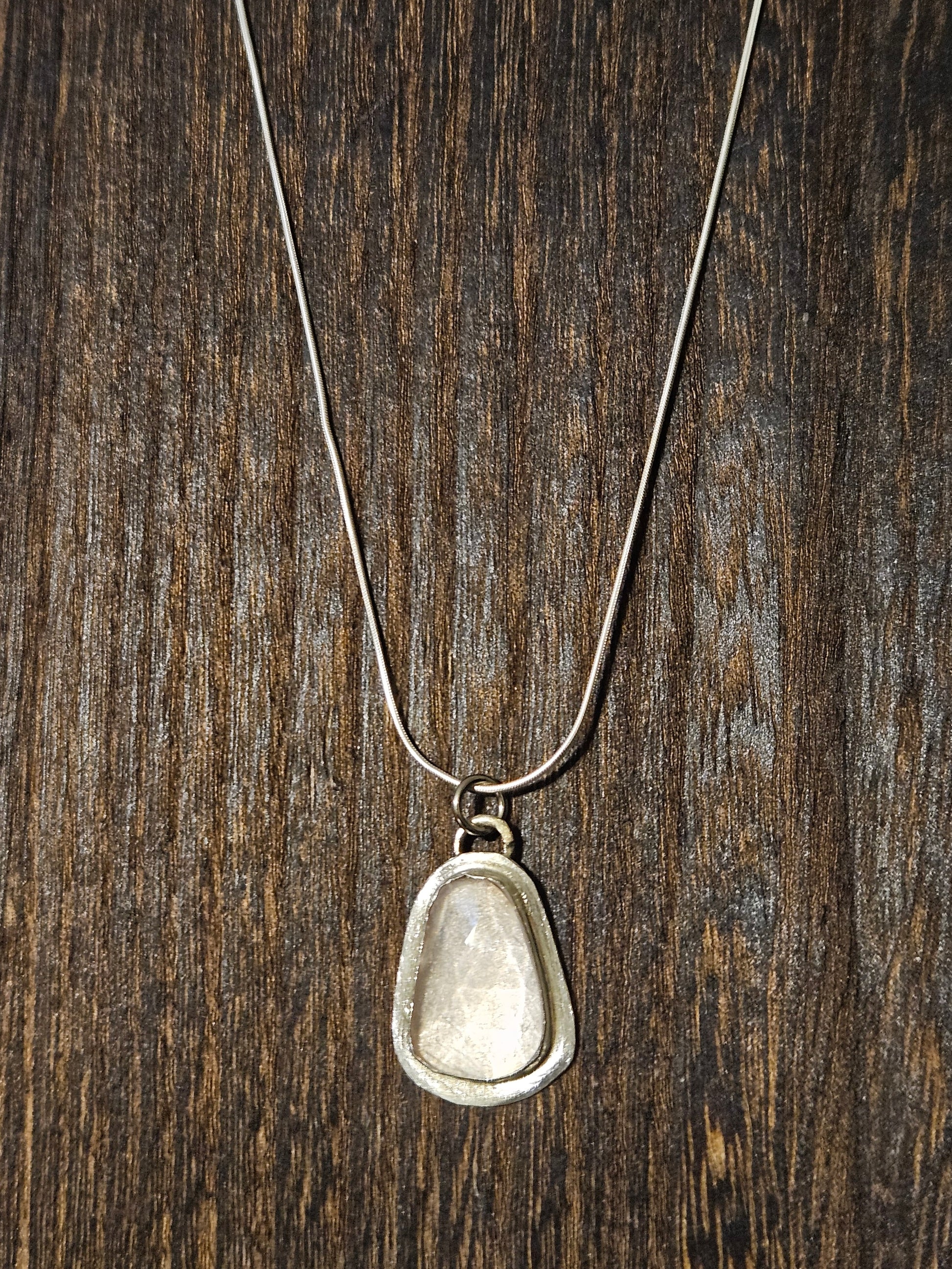 This soft, freeform rose quartz pendant is hand-set in .999 fine silver and hangs from an 18" hypoallergenic rhodium-plated sterling silver chain. Its smooth, irregular teardrop shape gives it an earthy, natural feel—like a polished river stone charged with love and intention. The brushed bezel and hand-shaped frame add subtle texture and warmth, reflecting the handmade spirit of Miss Mello Jewelry.